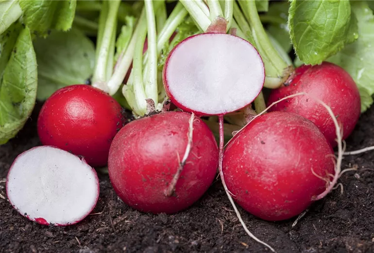 Wer frisches Gemüse im eigenen Garten anbauen will, mit gärtnern bisher aber nicht viel am Hut hatte, der muss nicht auf frisches Gemüse verzichten. Es gibt viele Sorten, die sehr gut für Anfänger geeignet sind und garantiert immer gelingen. Dazu gehören vor allem Radieschen. Sie sind die wahren Sprinter im Gemüsebeet und sind oft schon wenige Wochen nach der Aussaat erntereif. Radieschen werden im Frühjahr in Reihen direkt ins Beet ausgesät. Dabei sollten die einzelnen Samen nicht zu dicht beieinander gesät werden, damit sich die Pflanzen nicht gegenseitig in die Quere kommen. Das Einzige, was bei Radieschen zu beachten ist: der Boden, in dem sie wachsen, muss regelmäßig feucht gehalten werden. Wenn der Boden der Radieschen abwechselnd feucht und trocken ist, platzen die Radieschen auf.