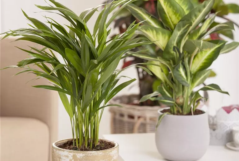 Die Steckenpalme mag es ebenfalls halbschattig. Denn dort, wo grelle Sonne auf die Blätter trifft, sind diese schnell gelb und fallen ab. Der Wasserbedarf ist auch hier recht hoch, und bei Zimmertemperatur fühlt sie sich wohl.