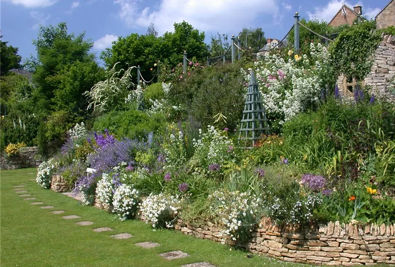 Der Senkgarten wird von allen vier Seiten mit einer Mauer eingefasst. Ideal zum Einfassen der Hangböschung eignen sich Natursteinmauern. Solche Trockenmauern verleihen dem Senkgarten ein natürliches Flair. Sie werden am Fuße der Böschung mit leichter Neigung angelegt. Die Ritzen zwischen den Steinen lassen sich wunderbar mit Pflanzen begrünen, die es gerne karg mögen. Wer es lieber etwas nüchterner mag, der kann anstelle einer Natursteintrockenmauer die Böschung auch mit Pflanzsteinen aus Beton abstützen.