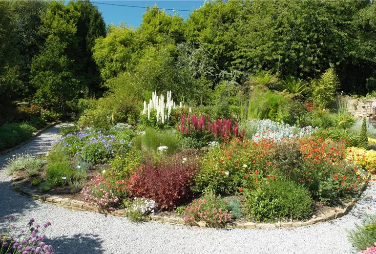 Hauptwege sollten eine Breite von 110-160 cm haben und eine feste, gut begehbare Oberfläche besitzen. Die weniger benutzten Nebenwege sind schmaler, mindestens aber 60 cm breit, und dürfen beispielsweise auch mit losem Material wie Rindenmulch oder Kies angelegt werden. Und an manchen Stellen reichen sogar einzelne Trittplatten aus, um zu zeigen, wo es lang geht. Bei der Wegeführung hat man die Wahl zwischen gerader oder geschwungener Linie. Die Entscheidung fällt zum einen aufgrund des Stil des Gartens und des Hauses, zum anderen wie direkt und schnell der Weg zum Ziel führen soll.