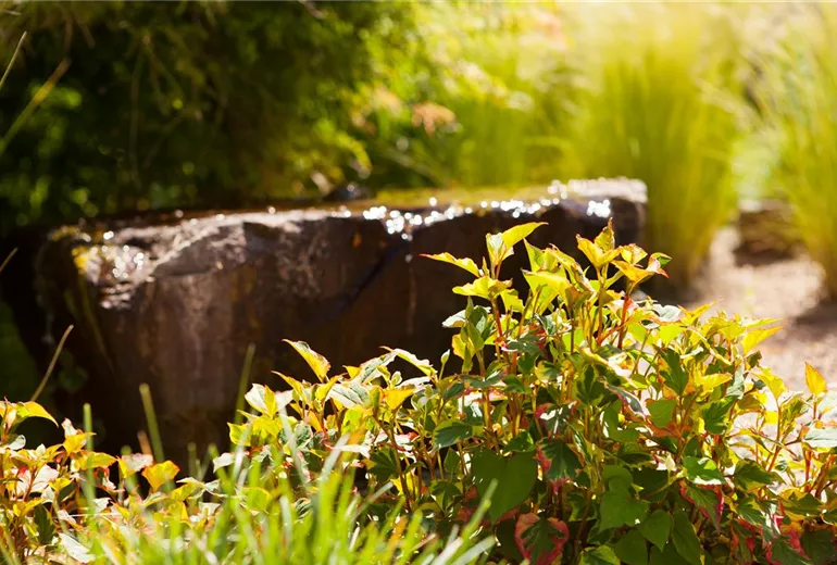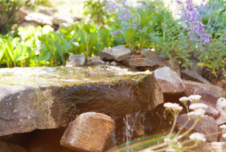 Als Quellsteine werden Findlinge meist hochkant installiert. Wobei man in erster Linie Steine verwendet, die sich optisch vom Rest der Installation abheben. Besonders schön sind dabei die verschiedenen Marmorarten, die je nach Abbaugebiet sehr schöne Farbspiele und Maserungen aufweisen. Aber auch Granit und Sandsteine sind sehr beliebt, um Brunnen und Teichen einen schönen Rahmen zu geben.