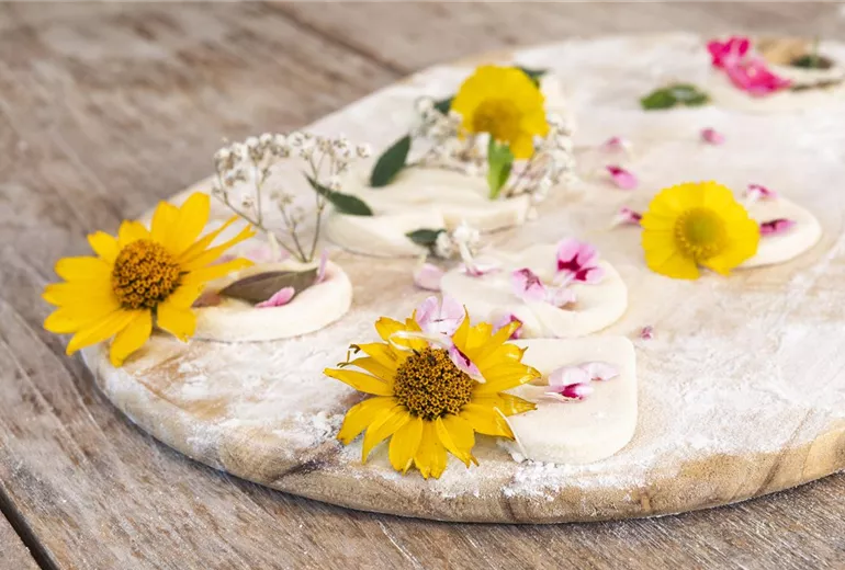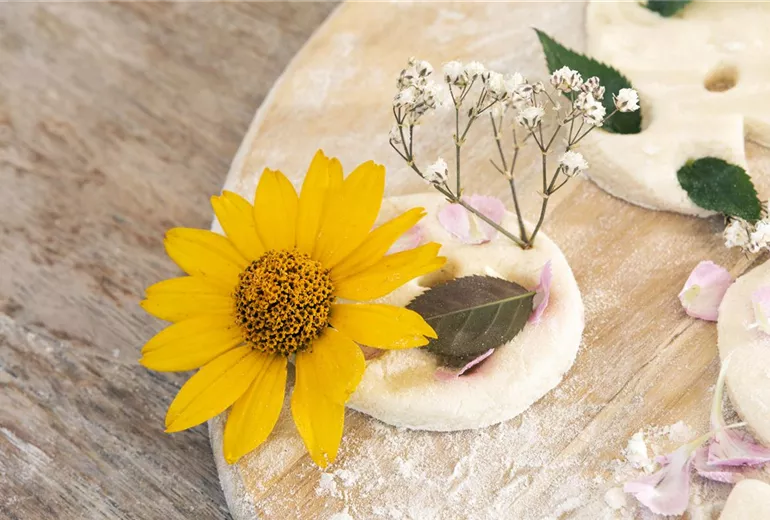Hübsche Blüten und Salzteig passen super zusammen, weil sich damit hübsche Anhänger gestalten lassen, die den Sommer auch an die kahlsten Stellen im Garten bringen. Dafür braucht es nur Mehl, Wasser, Salz und viele verschiedene Sommerblüten.