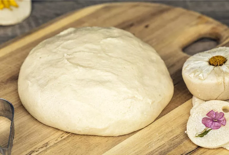 Das schöne an Salzteig? Er geht wahnsinnig schnell und einfach zu machen. Dafür werden in einer großen Rührschüssel 2 Tassen Mehl, 1 Tasse Wasser und 1 Tasse Salz miteinander vermischt. Das geht entweder mit einem Handrührgerät und Knetharken, oder einfach mit den Fingern. Die Zutaten solange verkneten, bis ein glatter und formbarer Salzteig entsteht. Sollten sich die Zutaten nicht verbinden oder der Salzteig zu flüssig werden, einfach nach Gefühl Wasser oder Mehl hinzugeben, je nachdem, was noch zum glatten Teig fehlt. Wenn der Salzteig fertig ist, kann er auf einer bemehlten Arbeitsfläche dünn ausgerollt werden. Wer im Sommer draußen arbeiten möchte, kann ein großes Holzbrett nehmen und den Salzteig darauf ausrollen.