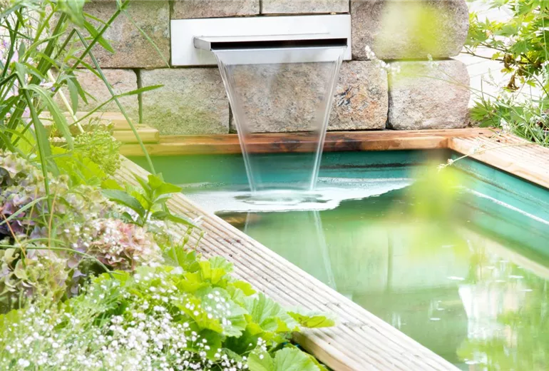 In Verbindung mit einem Wasserbecken kann man sich mit einem Wasserfall Urlaubsfeelig in den eigenen Garten holen. Gerade im Sommer, wenn die Tage länger sind und man bis spät in die Nacht auf der Terrasse entspannen kann, sind Wasserfälle eine stilvolle und hübsche Alternative zum plätschernden Springbrunnen. Angetrieben werden die Wasserfälle von einer Tauchpumpe. Kinder werden besonders viel Saß haben, die Hand unter den Wasserfall zu halten und ganz nebenbei lernen sie das Element Wasser besser kennen. Und wem der Anblick vom kühlen Nass im Sommer noch nicht reicht, der kann ja einfach mal den Fuß unter den Wasserfall halten. Oder: wie wäre e mit einem Wasserfall im Schwimmteich?