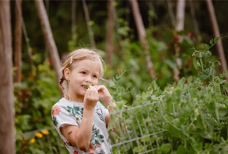 Um den jungen Gärtnern schnelle Erfolgserlebnisse zu garantieren, sollten vor allem rasch wachsende Kulturen verwendet werden, wie z. B. Radieschen ( Raphanus sativus ), Erbsen ( Pisum sativum ), Sonnenblumen ( Helianthus annuus ), Kirschtomaten ( Solanum lycopersicum ), Naschzipfel ( Capsicum annuum ) und Zucchini ( Cucurbita pepo ). Daneben kommen bei Kindern aber auch Gehölze und Stauden mit Früchten zum Naschen gut an, wie Obststräucher oder -bäume, Erdbeeren ( Fragaria ), Rhabarber ( Rheum rhabarbarum ) und viele Weitere. Besonders spannend ist für Kinder die Kultur ungewöhnlicher Obst- und Gemüsesorten, die es in kaum einem Supermarkt zu kaufen gibt. Das können ungewöhnliche Kartoffelsorten wie etwa „Blauer Schwede“ ebenso sein wie so manche Wildobstgehölze, wie z.B. die Felsenbirne ( Amelanchier ).